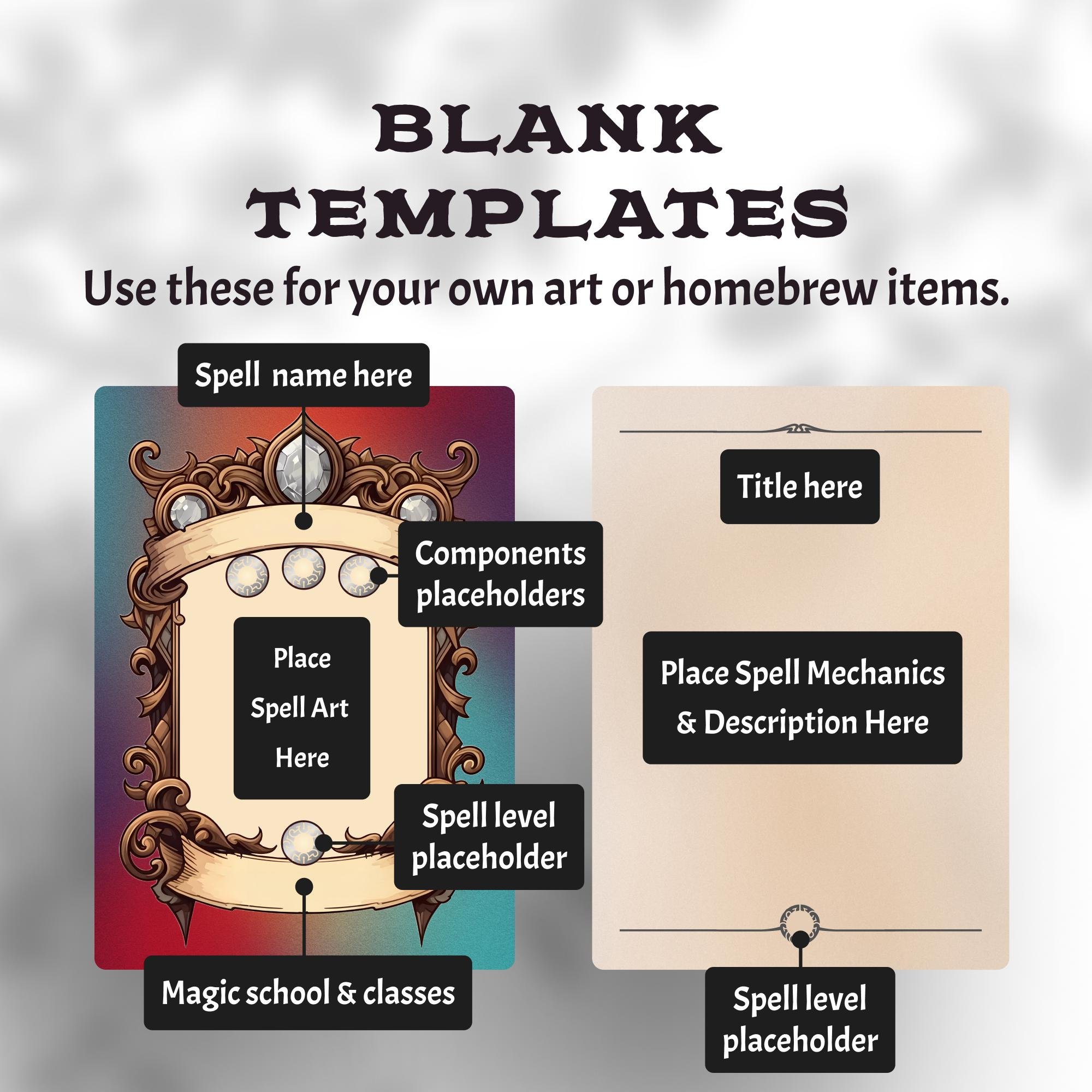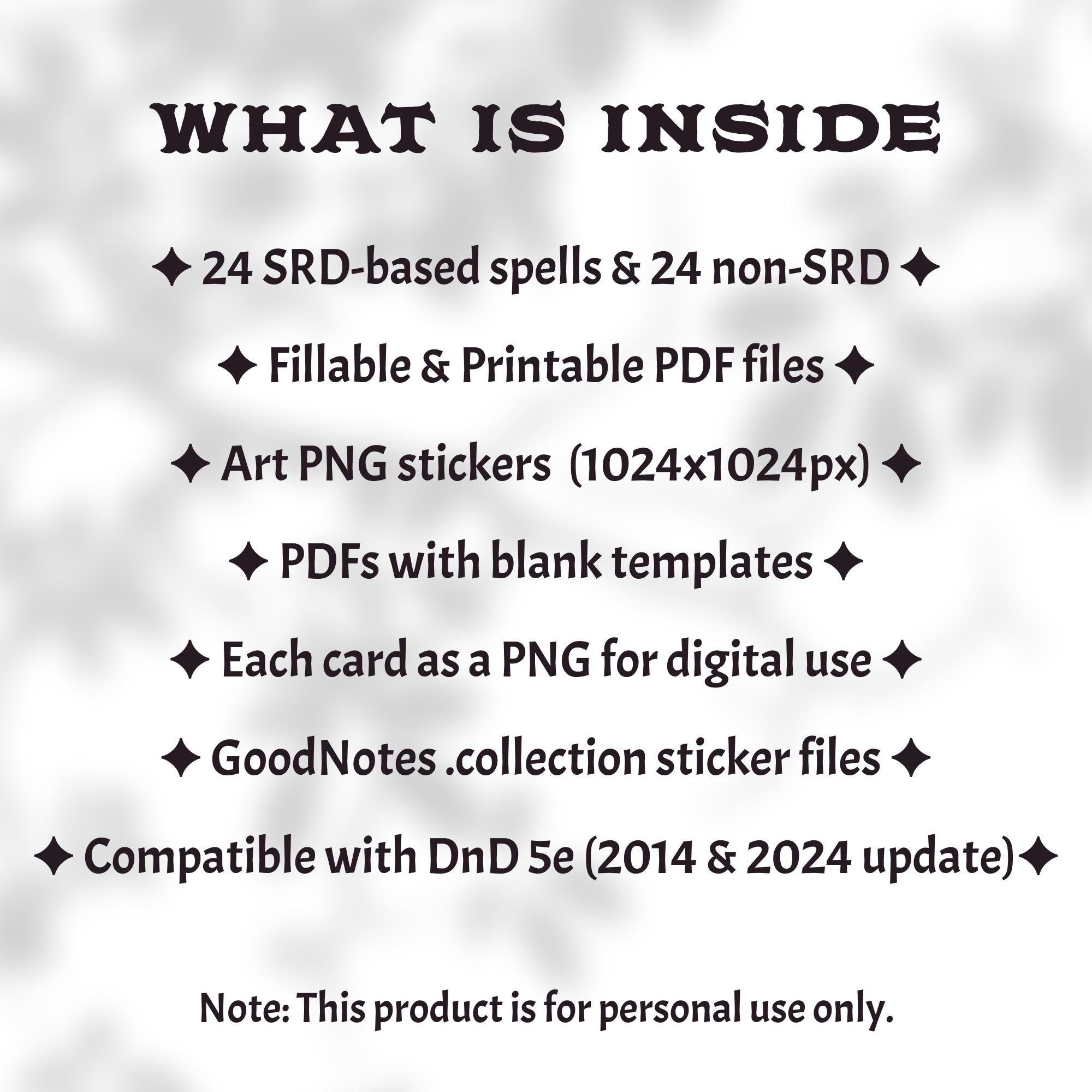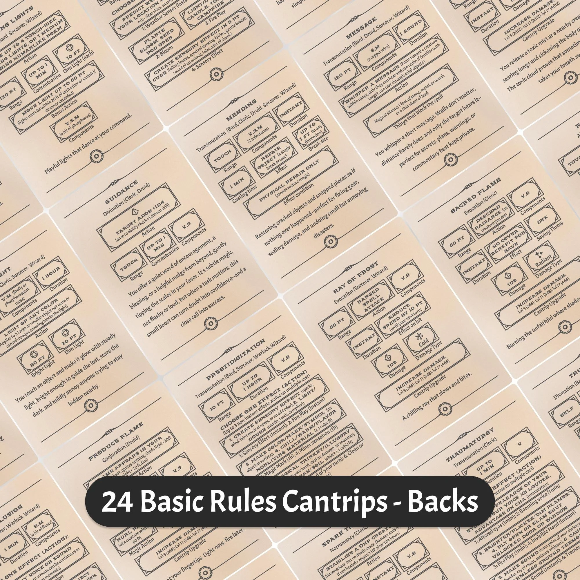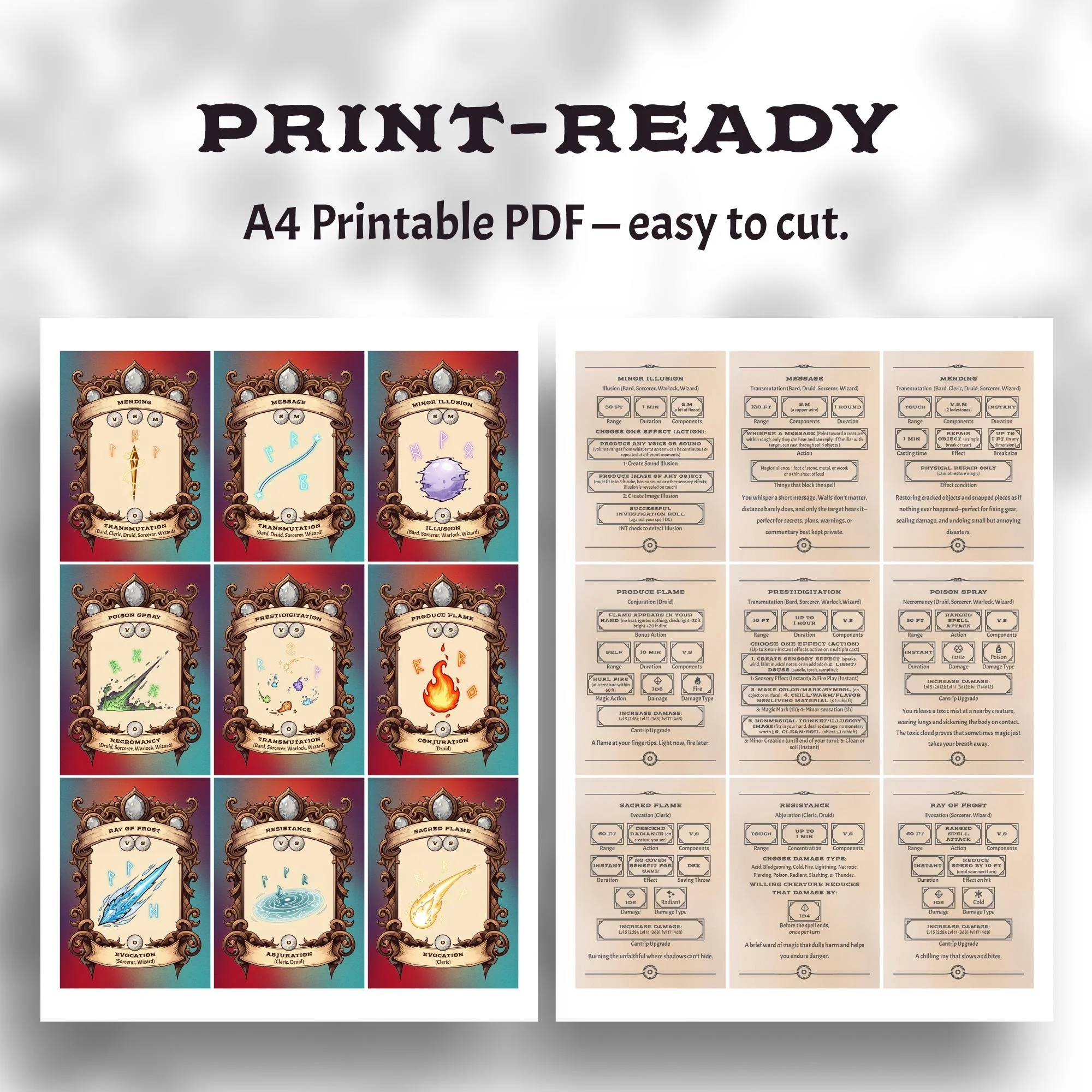 Set of printed D&D handouts with fantasy-themed artwork, titles, and icons for spells, armor, and tools.
