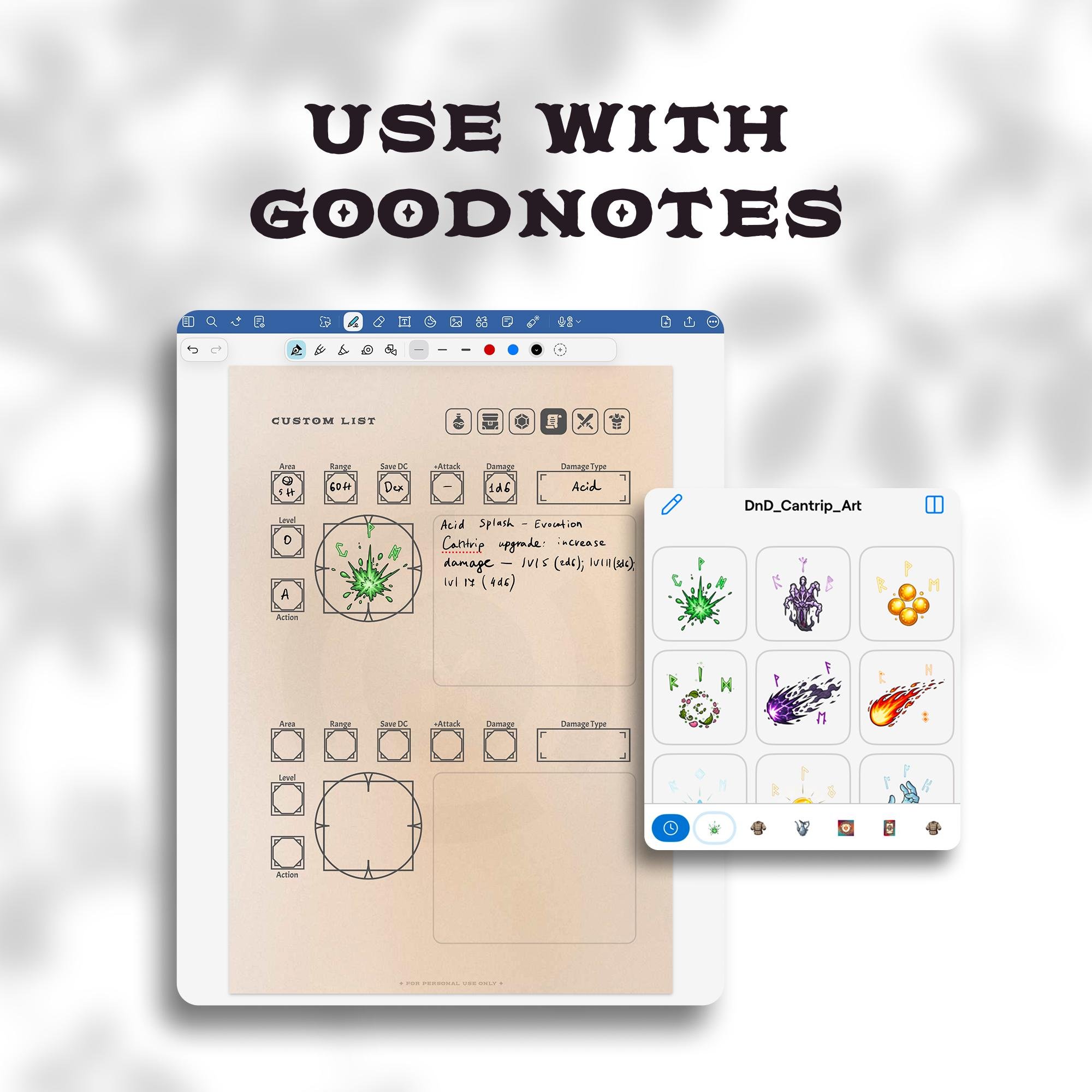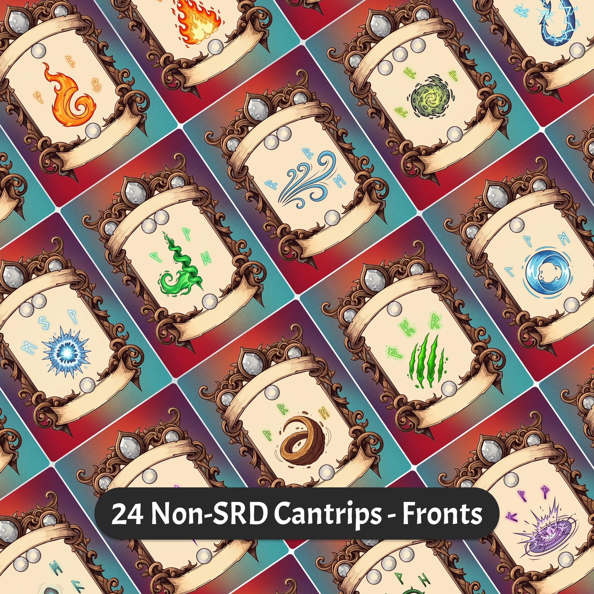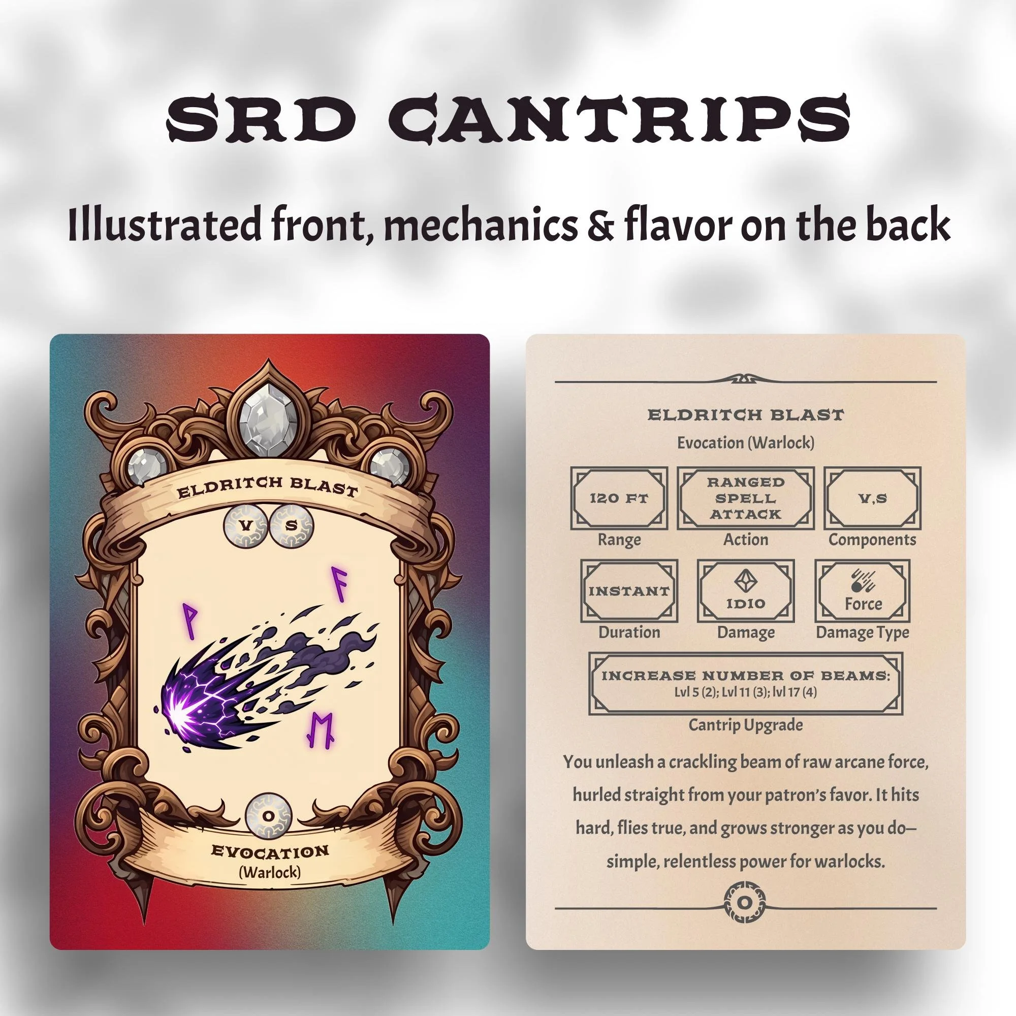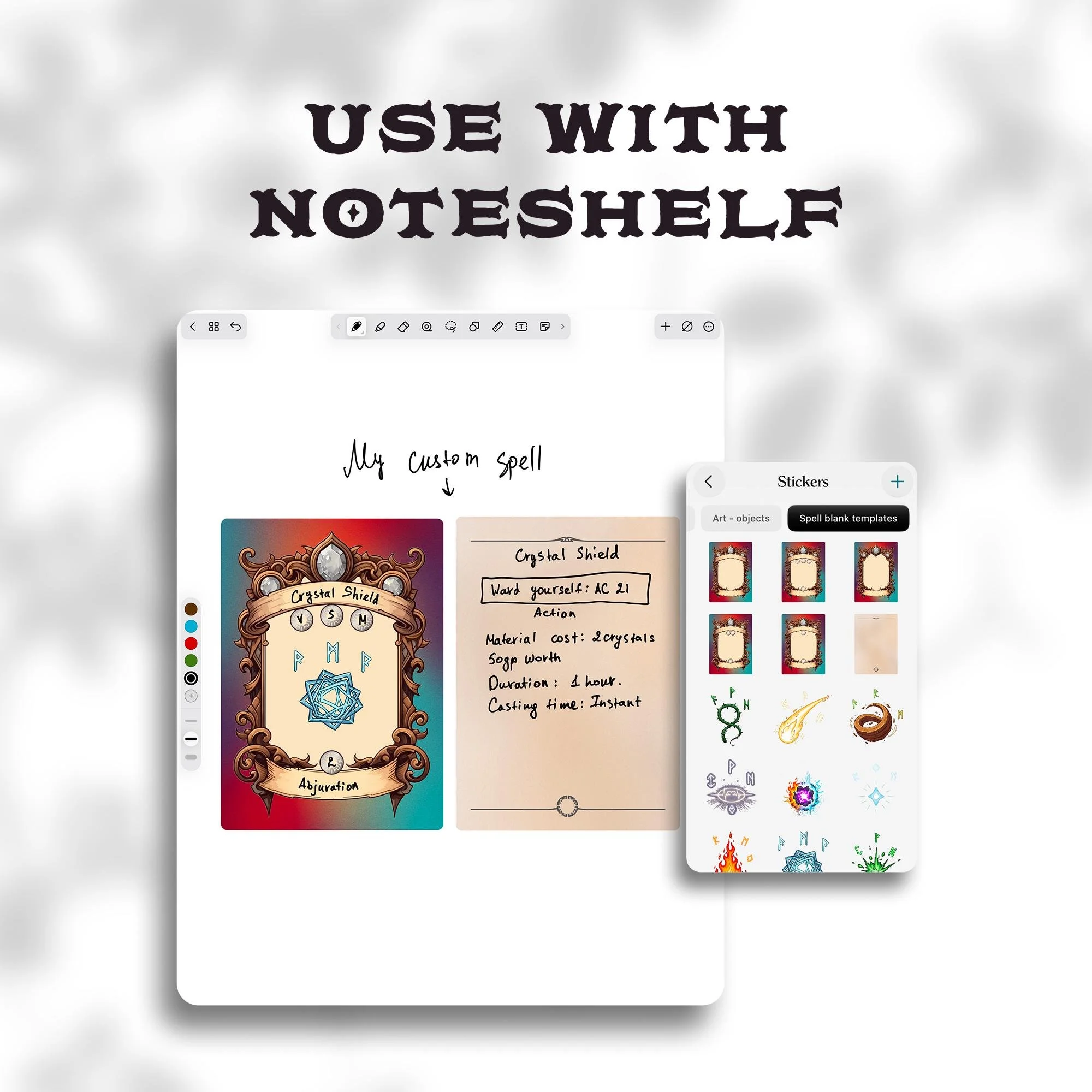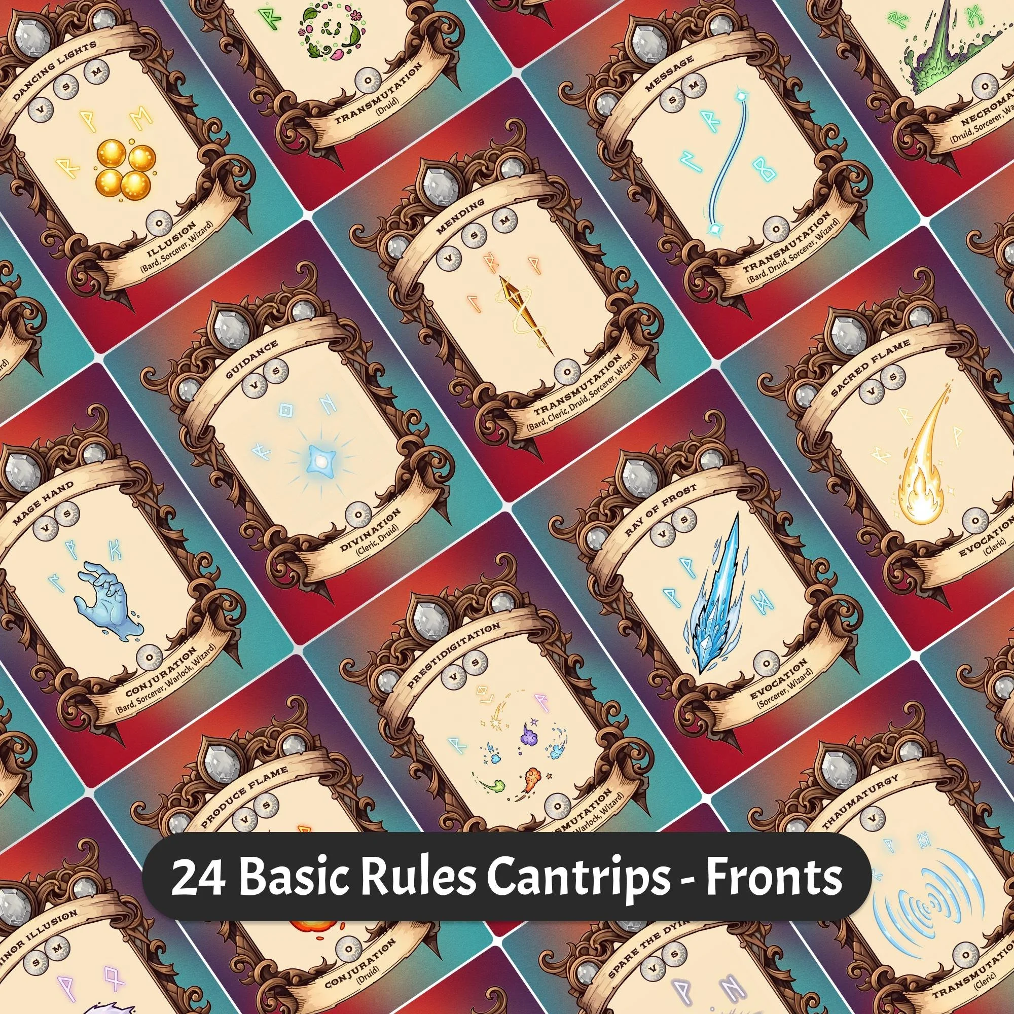 Set of printed D&D handouts with fantasy-themed artwork, titles, and icons for spells, armor, and tools.